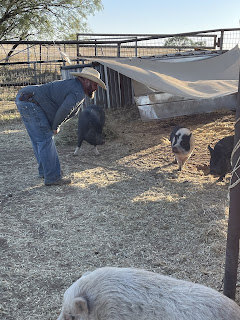 This is on the list of things I never thought I would see. Ronnie and I were out in the pig pen. Ronnie actually sat down in the pig pen and was petting the pigs. The pigs seemed to like him and the attention he was giving them. It was a sight I really had no idea would happen. It made my heart happy to see this. He is bonding with the pigs.